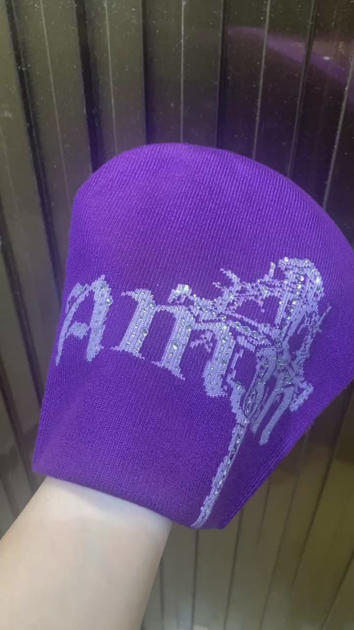 Each colorway brings its own energy, but the Purple AM3N Beanie stands apart, featuring hand-placed rhinestone detailing that adds a subtle shine and elevated finish, making it the most eye-catching piece in the collection.